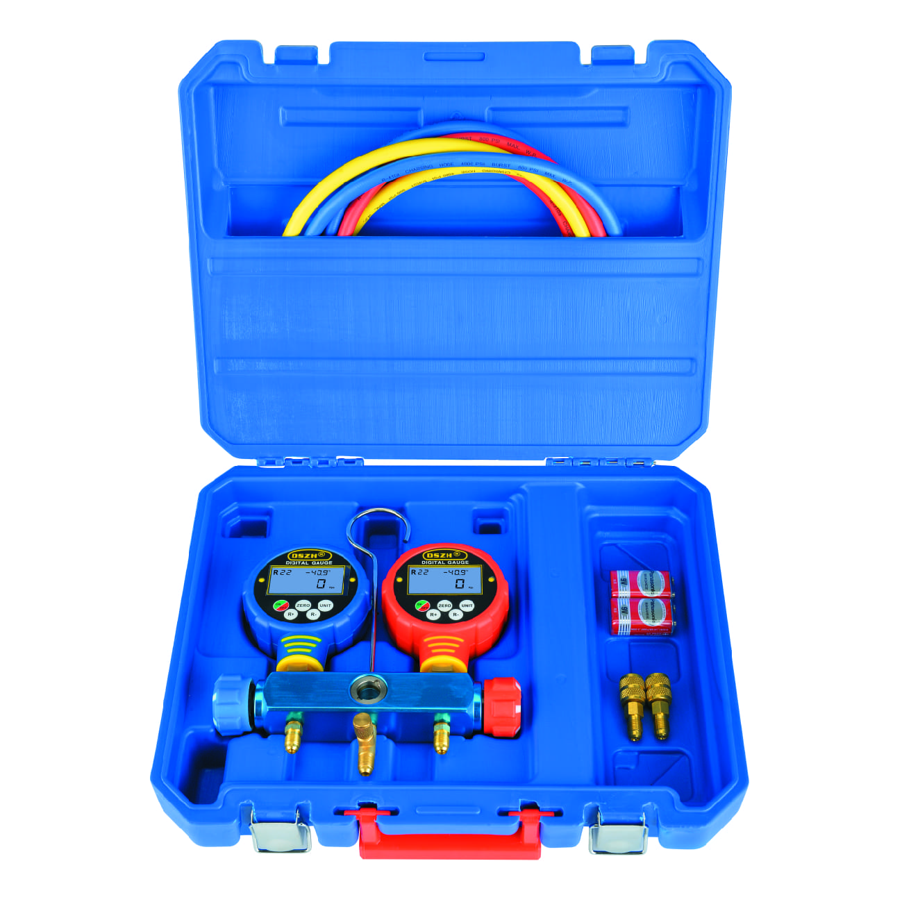 Цифровая манометрическая станция DSZH WK-6882L представляет собой двухвентельный цифровой манометрический коллектор с комплектом из трех зарядных шлангов и смотровым стеклом, поставляется в пластиковом кейсе. Цифровой мановакуумметр WK-6882. В памяти у него температуры кипения по 82 хладагентам, можно изменять единицы измерения температуры (°C, °F) и давления (кПа, Бар, Psi, торр, кгс/см2, дюйм рт.ст., мм рт.ст.), можно переключать в режим вакуумметра (нажатием и удержанием клавиши "ZERO", в режиме вакуумметра не отображается хладагент и температура - только давление и показывает % от "полного" вакуума).